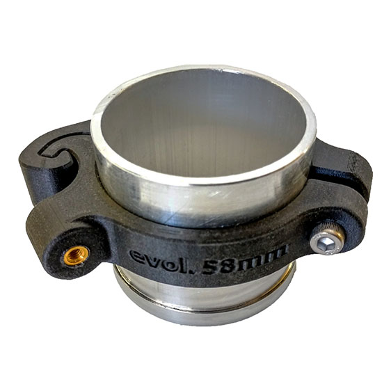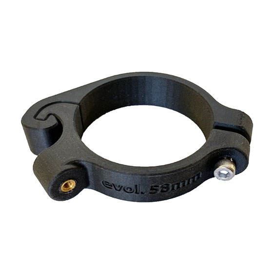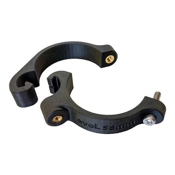Elegant solution to mount potentiometer to fork leg. Two-piece design makes installation without removal of the fork tube a snap. 3D printed from carbon-infused nylon — extremely lightweight, strong, temperature and vibration resistant. Brass threaded inserts provide robust fastening of potentiometer to mount, and mount to fork. Bracket will work on either fork leg. Specify fork tube diameter at desired clamp location and potentiometer screw size when ordering.