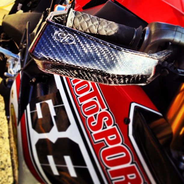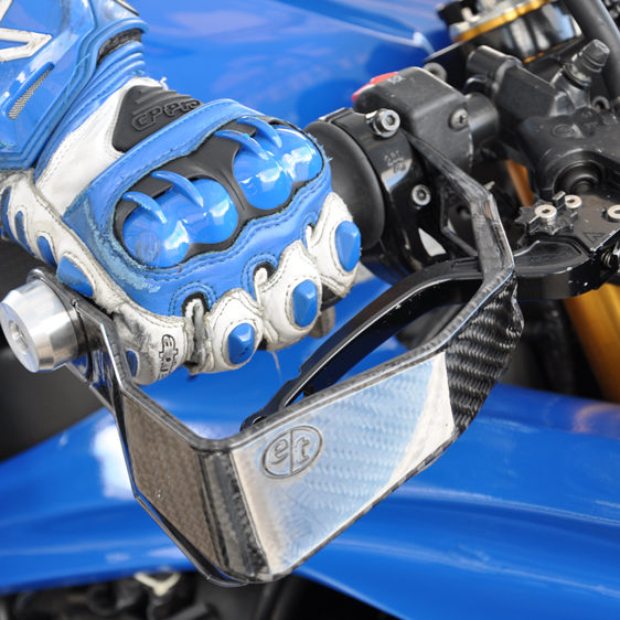 The Evol Technology Super Moto Pro Lever Guard is a serious piece of racing hardware that provides great safety benefit and proven aerodynamic advantage, not to mention a menacing aesthetic improvement to any bike. It is comprised of a carbon fiber core encased in a flexible urethane casting. Kit comes complete with Carbon Composite Lever Guard, Hard Anodized Billet Aluminum bar end, and mounting instructions. Fits most sport and super moto bikes.