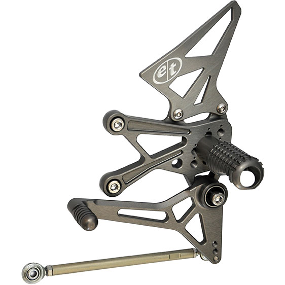 Compatible with stock quick shift sensor and configurable for GP or Standard shift pattern configuration. Adjustable footpeg position over a range to suit riders of all sizes, abilities, and ergonomic preferences. Readily available in Hard Black anodizing; Hard Magnesium available via special order. Elevate your racecraft with Evol Technology Pro Rearsets for the Aprilia RSV4.